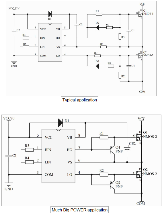 •主要特點:可完全工作到+600V,可耐受負(fù)瞬態(tài)電壓,抗v /dt,柵極驅(qū)動供電范圍從5到20V,欠壓鎖定,3.3V, 5V和15V輸入邏輯兼容,兩個通道的傳播延遲匹配。