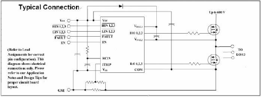 •主要特點(diǎn):浮動通道設(shè)計用于自啟動操作,完全工作到+ 600v,可承受負(fù)瞬態(tài)電壓,柵極驅(qū)動供電范圍從10v到20v,所有通道欠壓鎖定,過流關(guān)斷關(guān)閉所有六個驅(qū)動器,獨(dú)立的3個半橋驅(qū)動器,所有通道匹配的傳播延遲,交叉?zhèn)鲗?dǎo)防止邏輯,低側(cè)輸出與輸入失相。3.3 V邏輯兼容,低電壓柵極驅(qū)動,抗噪性更好,外部可編程延遲,故障自動清除,所有部件均無鉛
