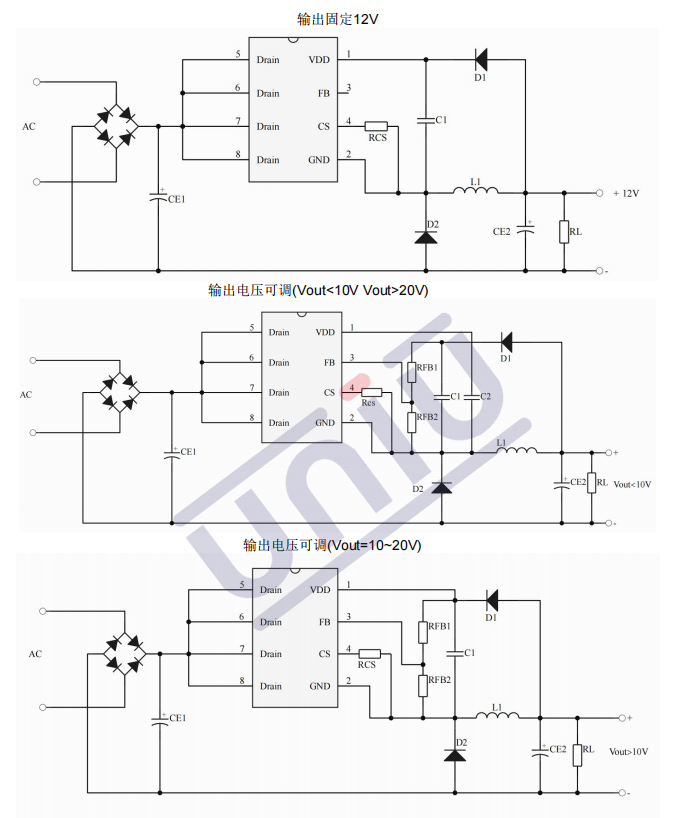 •主要特點:集成 650V 高壓啟動電路;多模式控制、無異音工作;支持降壓和升降壓拓?fù)?默認(rèn) 12V 輸出( FB 腳懸空);待機功耗低于 50mW;良好的線性調(diào)整率和負(fù)載調(diào)整率;集成軟啟動電路;內(nèi)部保護功能 :過載保護 (OLP);逐周期電流限制 (OCP);輸出過壓保護 (OVP);VDD 過壓、欠壓和電壓箝位保護