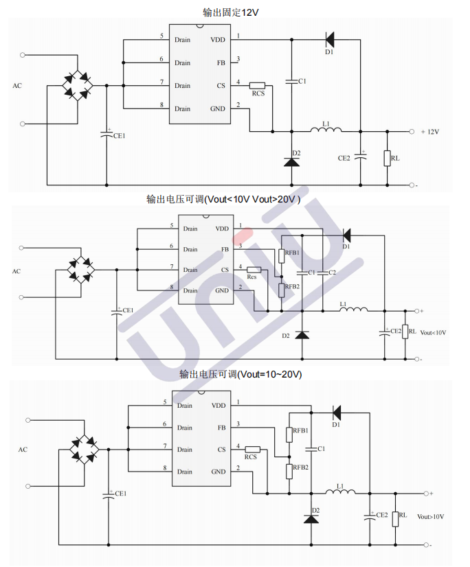 •主要特點:集成 650V 高壓啟動電路;多模式控制、無異音工作;支持降壓和升降壓拓?fù)?默認(rèn) 12V 輸出( FB 腳懸空);待機(jī)功耗低于 50mW;良好的線性調(diào)整率和負(fù)載調(diào)整率;集成軟啟動電路;內(nèi)部保護(hù)功能 :過載保護(hù) (OLP);逐周期電流限制 (OCP);輸出過壓保護(hù) (OVP);VDD 過壓、欠壓和電壓箝位保護(hù)