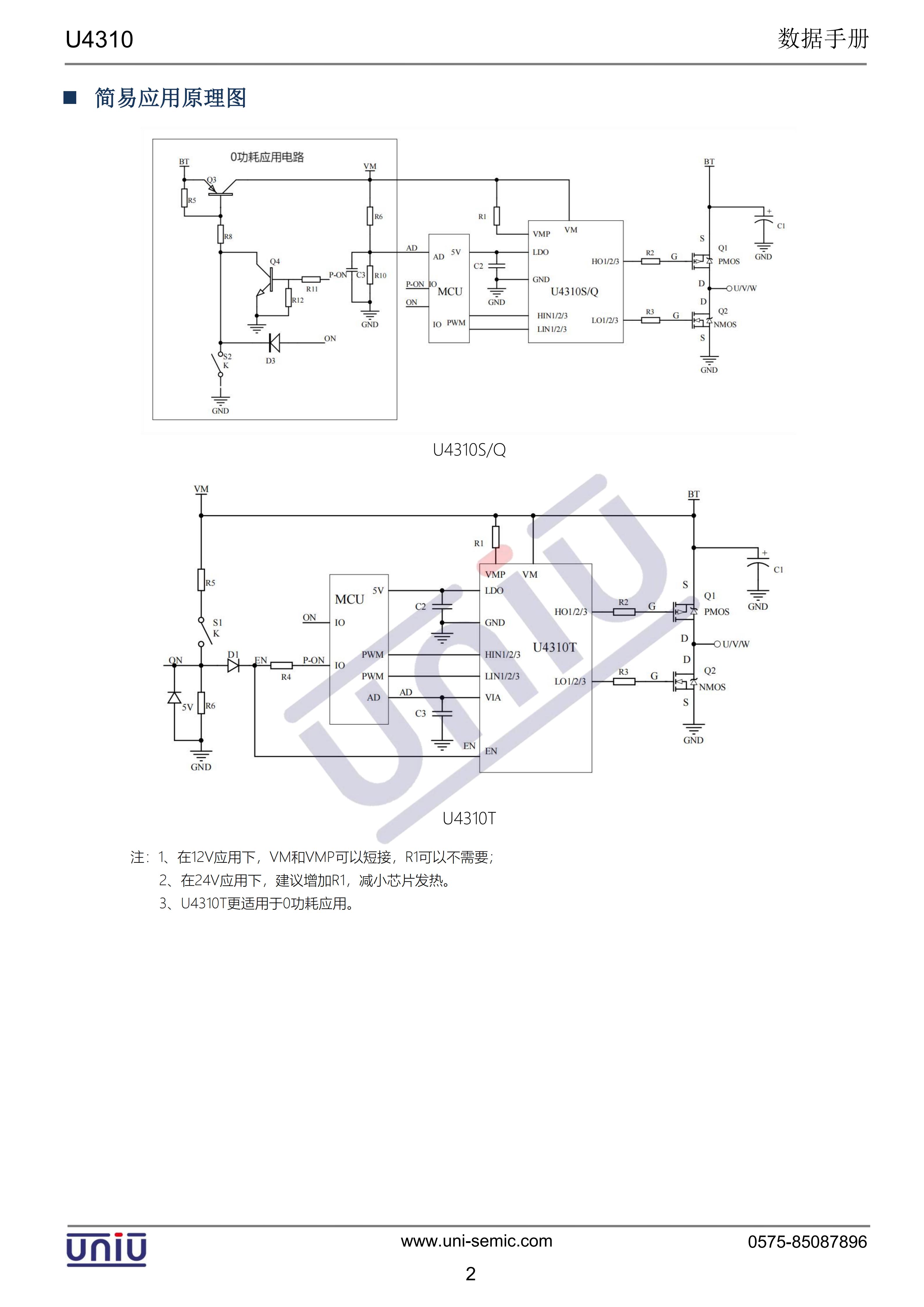 集成EN控制(0功耗):U4310T;集成電壓檢測(cè)(10:1):U4310T;VM電壓范圍:5.0-40.0V;驅(qū)動(dòng)三相P+N獨(dú)立半橋;兼容3.3/5V輸入邏輯;驅(qū)動(dòng)電流:+400mA/-100mA(typ.);死區(qū)時(shí)間:60ns(typ.);集成VM欠壓保護(hù);集成5V LDO;5V LDO集成輸出短路保護(hù);