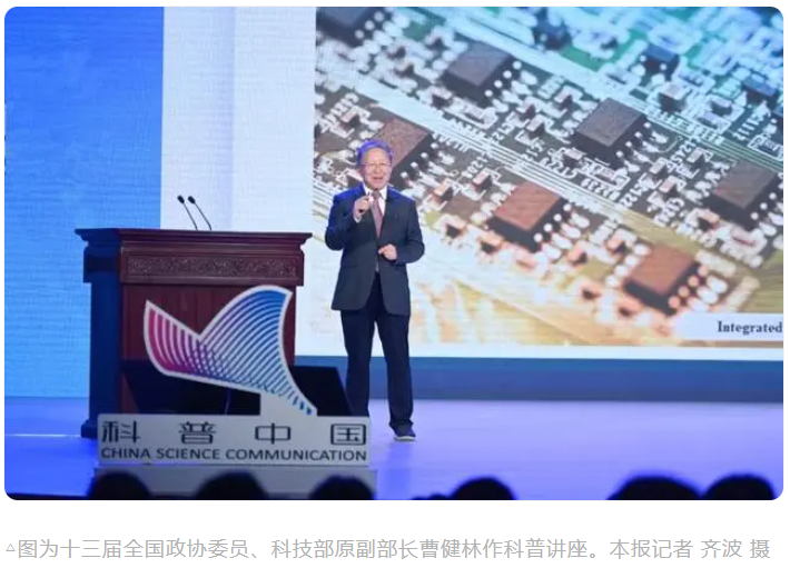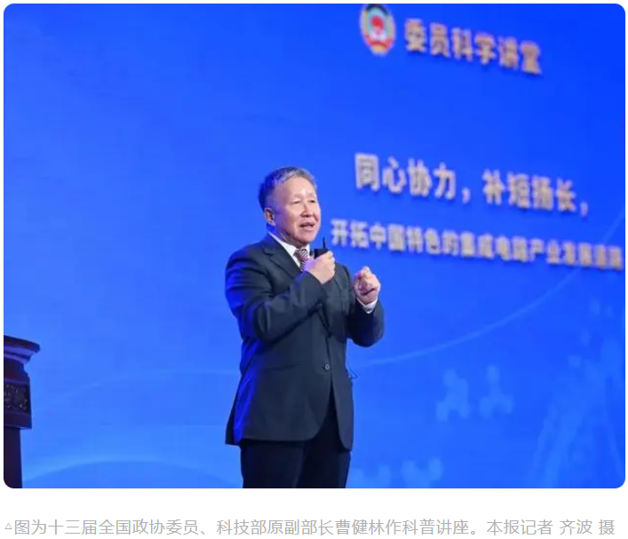 “芯片問題是事關(guān)百年發(fā)展的長(zhǎng)期戰(zhàn)略問題,不是短期應(yīng)急問題,必須持之以恒去發(fā)展。”“要充分發(fā)揮制度優(yōu)勢(shì),集中優(yōu)勢(shì)隊(duì)伍持續(xù)攻關(guān)。”“要敢于開辟新賽道,打造新生態(tài),推進(jìn)‘再全球化’。”……9月25日下午,寬敞明亮的全國政協(xié)禮堂里,十三屆全國政協(xié)委員、教科衛(wèi)體委員會(huì)副主任曹健林正站在舞臺(tái)中央巨大的顯示屏前,以“同心協(xié)力,補(bǔ)短揚(yáng)長(zhǎng),開拓中國特色的集成電路產(chǎn)業(yè)發(fā)展道路”為題,為坐在臺(tái)下的全國政協(xié)委員、地方政協(xié)委員、高校學(xué)生、科研工作者等700余名觀眾作科普講座。