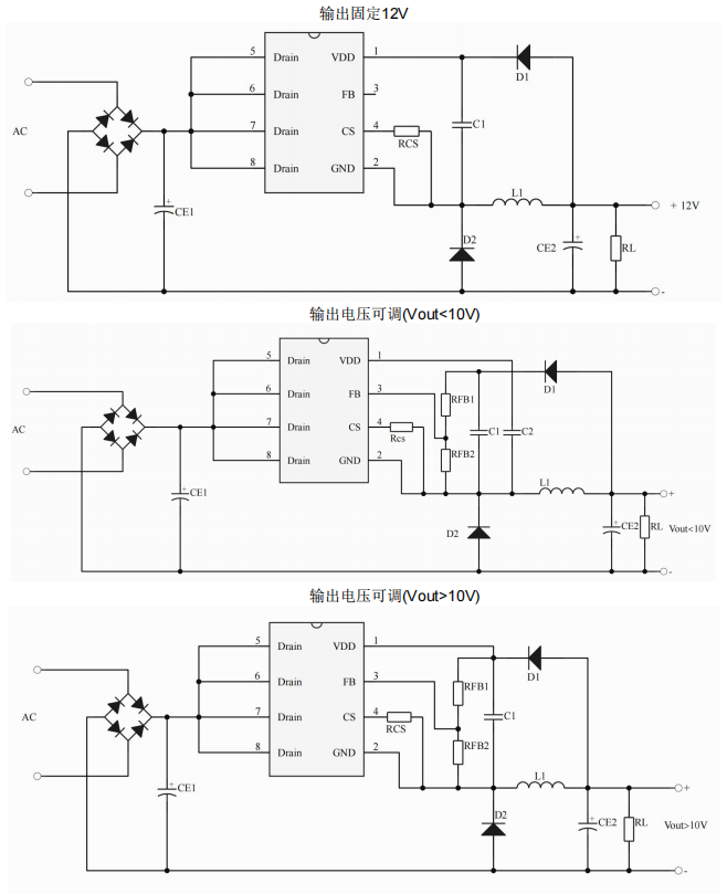 •主要特點(diǎn):集成 650V 高壓?jiǎn)?dòng)電路;多模式控制、無(wú)異音工作;支持降壓和升降壓拓?fù)?默認(rèn) 12V 輸出( FB 腳懸空);待機(jī)功耗低于 50mW;良好的線性調(diào)整率和負(fù)載調(diào)整率;集成軟啟動(dòng)電路;內(nèi)部保護(hù)功能 :過(guò)載保護(hù) (OLP);逐周期電流限制 (OCP);輸出過(guò)壓保護(hù) (OVP);VDD 過(guò)壓、欠壓和電壓箝位保護(hù)