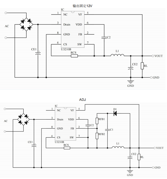 •主要特點(diǎn):集成9Ω,500V MOS ; 集成650V 高壓?jiǎn)?dòng)電路 ; 集成續(xù)流二極管 ; 多模式控制、無(wú)異音工作 ; 支持降壓和升降壓拓?fù)?/span> ; 默認(rèn)12V 輸出( FB 腳懸空) ; 待機(jī)功耗低于50mW ; 良好的線性調(diào)整率和負(fù)載調(diào)整率 ; 集成軟啟動(dòng)電路 ; 內(nèi)部保護(hù)功能:過(guò)載保護(hù) (OLP) 、 逐周期電流限制 (OCP) 、 輸出過(guò)壓保護(hù) (OVP) 、 VDD 過(guò)壓、欠壓和電壓箝位保護(hù)